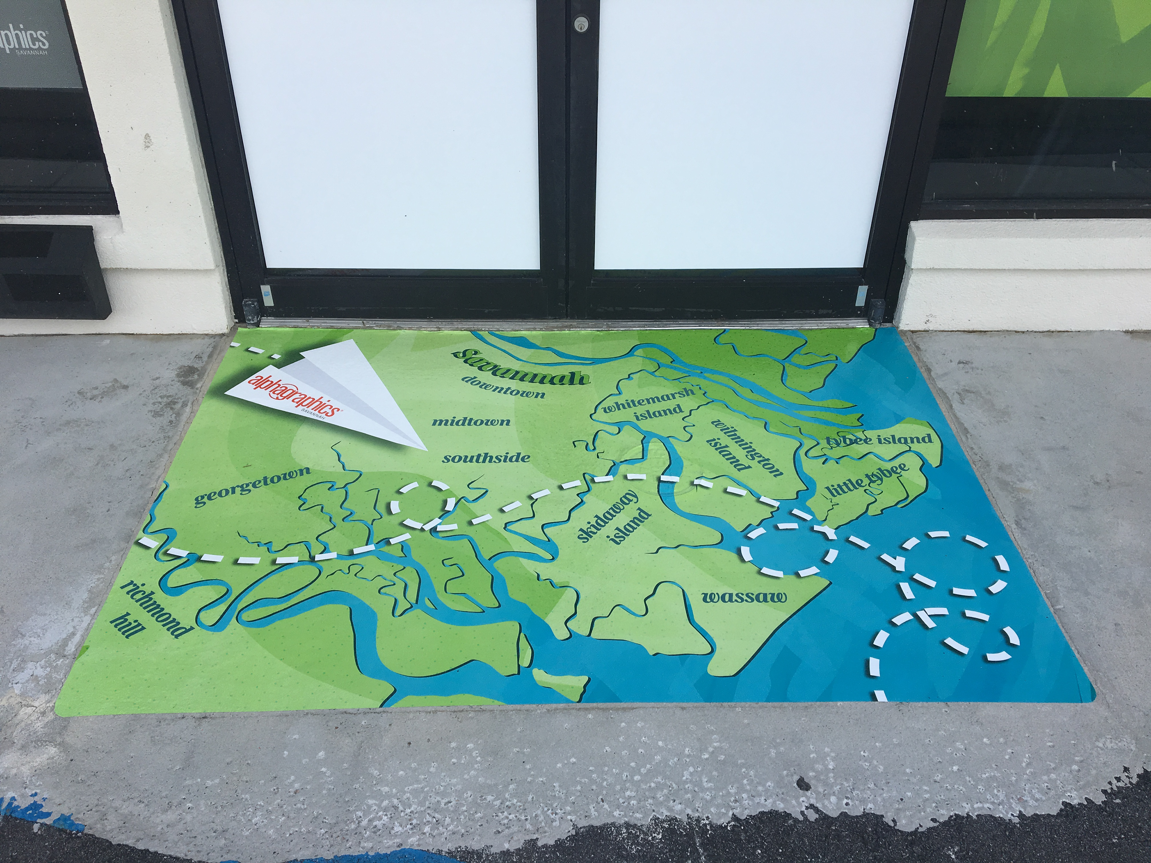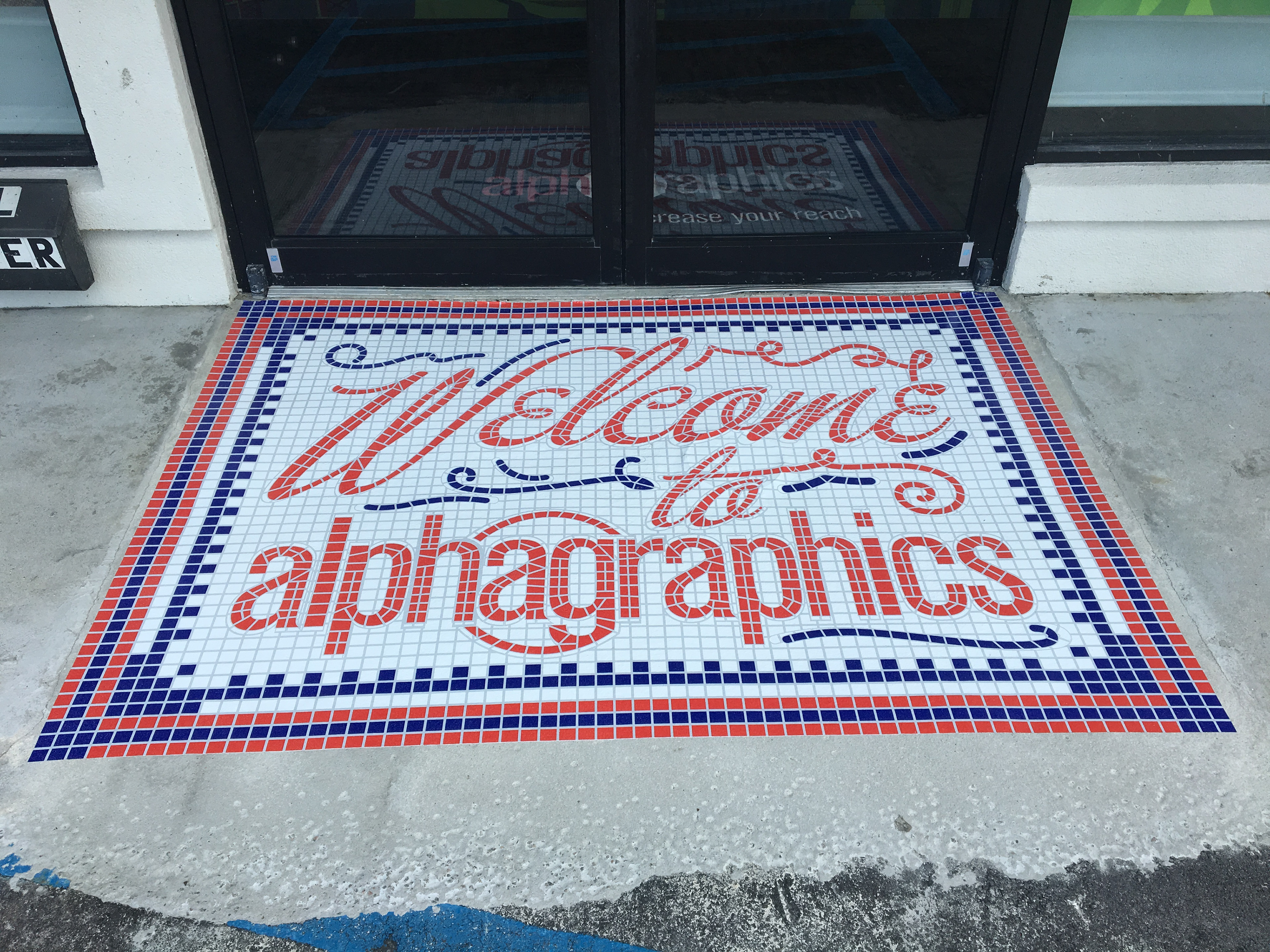Outdoor vinyl "floor mats" to welcome our customers!
